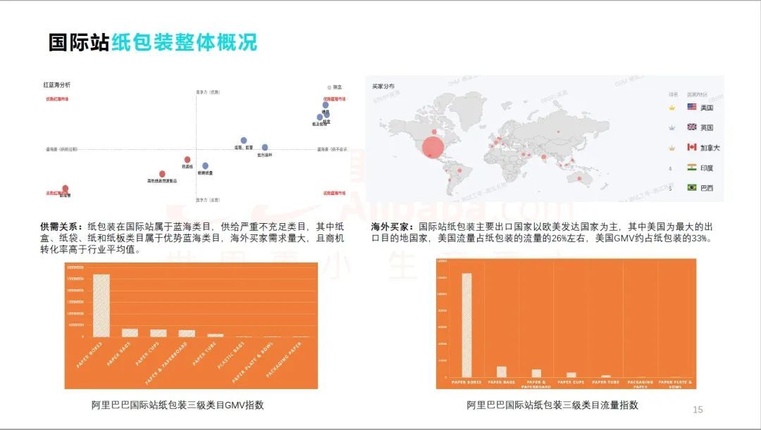 3、纸包装在国际站属于蓝海类目,供给严重不充足,其中纸盒、纸袋、纸和纸板类目属于优势蓝海类目,海外买家需求量大,且商机转化率高于行业平均值。这片蓝海市场你抓住了吗?