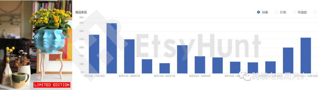 比如Etsy平台下这款人脸花盆商品,商品设计极具艺术感(诡异感),符合万圣节节日调性,此外,花瓶也是一款实用性较强的商品。通过销量数据不难看出,即使在非万圣节预热期的7月份,该商品周销量也能在250件以上。随着万圣节逐渐临近,该商品需求度得以升温,目前周销量仍在爬升中。