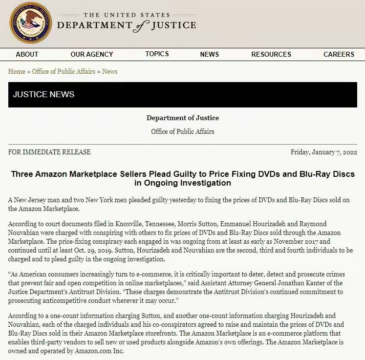 最近美国司法部官方网站通报,三名亚马逊卖家就DVD和蓝光光盘价格操纵事实进行了认罪。他们相互交换价格,串通建立底价,涉及的总销售额超过146万美元,"每个人参与的价格操纵阴谋至少从2017年11月开始一直持续到至少2019年10月29日"。