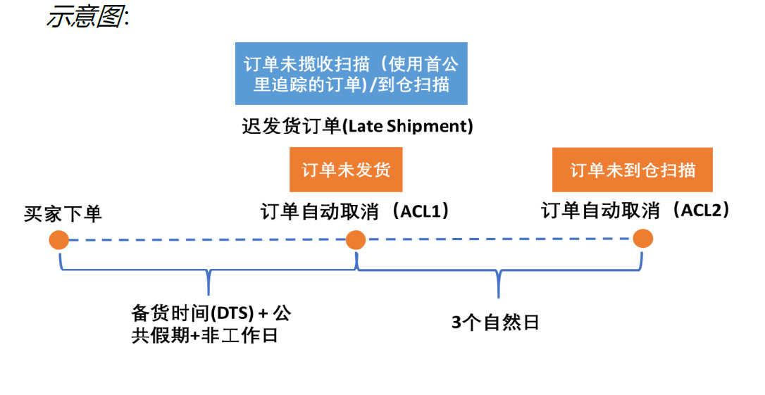 如果卖家没有在 DTS 日内"点击发货",或者订单没有在 DTS+3 个自然日内到仓扫 描,订单会被系统自动取消(auto-cancellation),影响卖家的订单未完成率(Nonfulfilment rate),会被罚分。