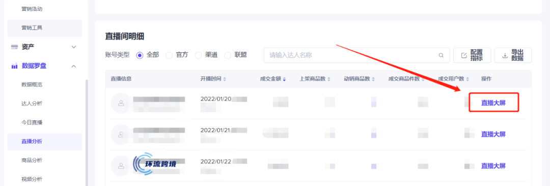 2、在数据罗盘下点击直播分析。