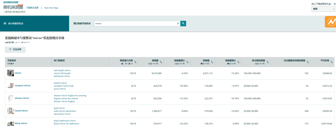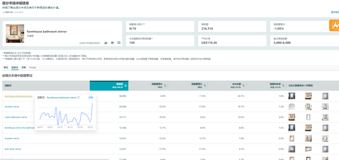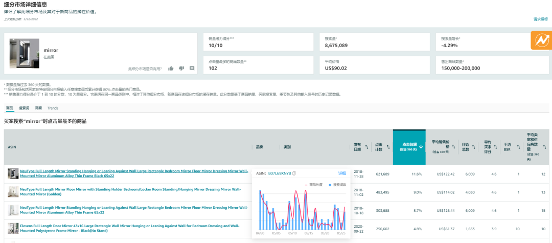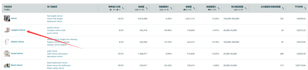 例如:我们想要了解搜索量增长率在360天以内大于39%的便携式化妆镜这个细分类目的详细内容,只需要点击相应的蓝色字体,就会进入便携式化妆镜的页面。