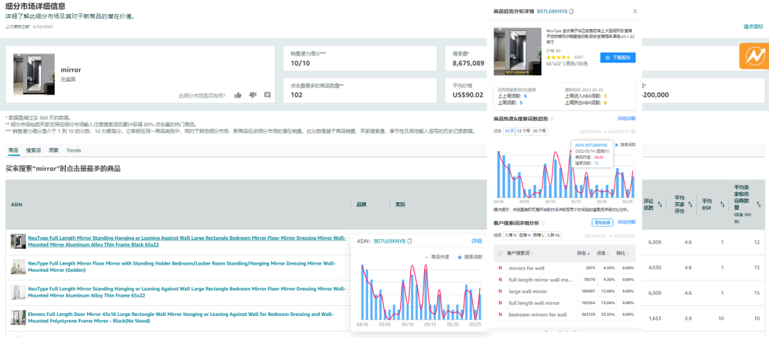 主要以你点击进来的某一个搜索词作为锚点,为你提供该关键词下亚马逊上的商品发布日期,点击次数,点击份额(过去360天),平均销售价格(过去360天),评论总数,平均买家评分,平均BSR,平均卖家和供应商数量(过去360天),你可以把这些维度用来自由排序得到你想要的商品,其结果比市面上所有的ERP都要精准得多。