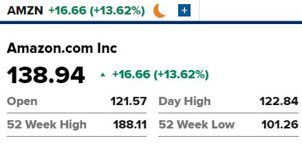 受此利好消息,亚马逊股价在盘后暴涨13.62%,报138.94美元。