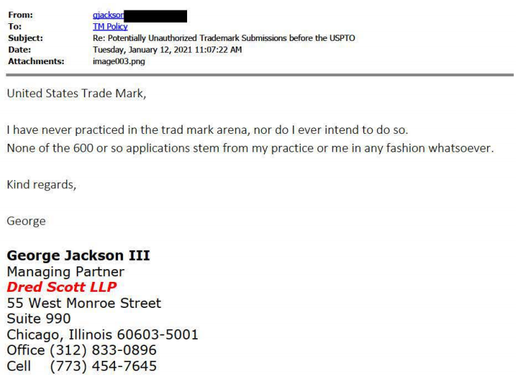 除Jeffrey Stewart Firestone外,该公司还委托了名为"Jackson George"的律师进行商标代理,提交了上千份商标申请。经过美国商标局查验,确实有名为"Jackson George III"的美国律师,但该律师回应并未给任何商标领域申请提供代理服务。